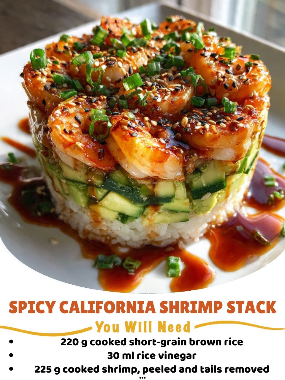 A fresh, vibrant, and flavor-packed layered dish inspired by sushi rolls — but easier, faster, and no rolling required! This Spicy California Shrimp Stack combines creamy avocado, crisp cucumber, seasoned rice, and spicy shrimp into a tall, beautiful stack that tastes just like your favorite sushi bowl in bite-sized tower form.