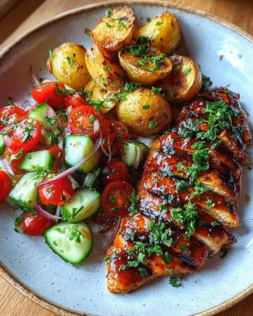 Honey Garlic Chicken with Roasted Potatoes & Fresh Cucumber Tomato Salad