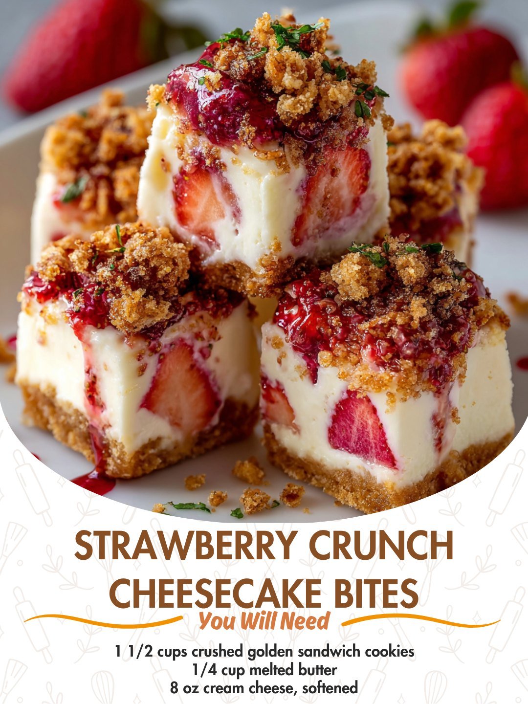🍓✨ Strawberry Crunch Cheesecake Bites Creamy no-bake cheesecake, sweet strawberry flavor, and a buttery golden cookie crunch — all packed into bite-sized treats! These Strawberry Crunch Cheesecake Bites taste like …