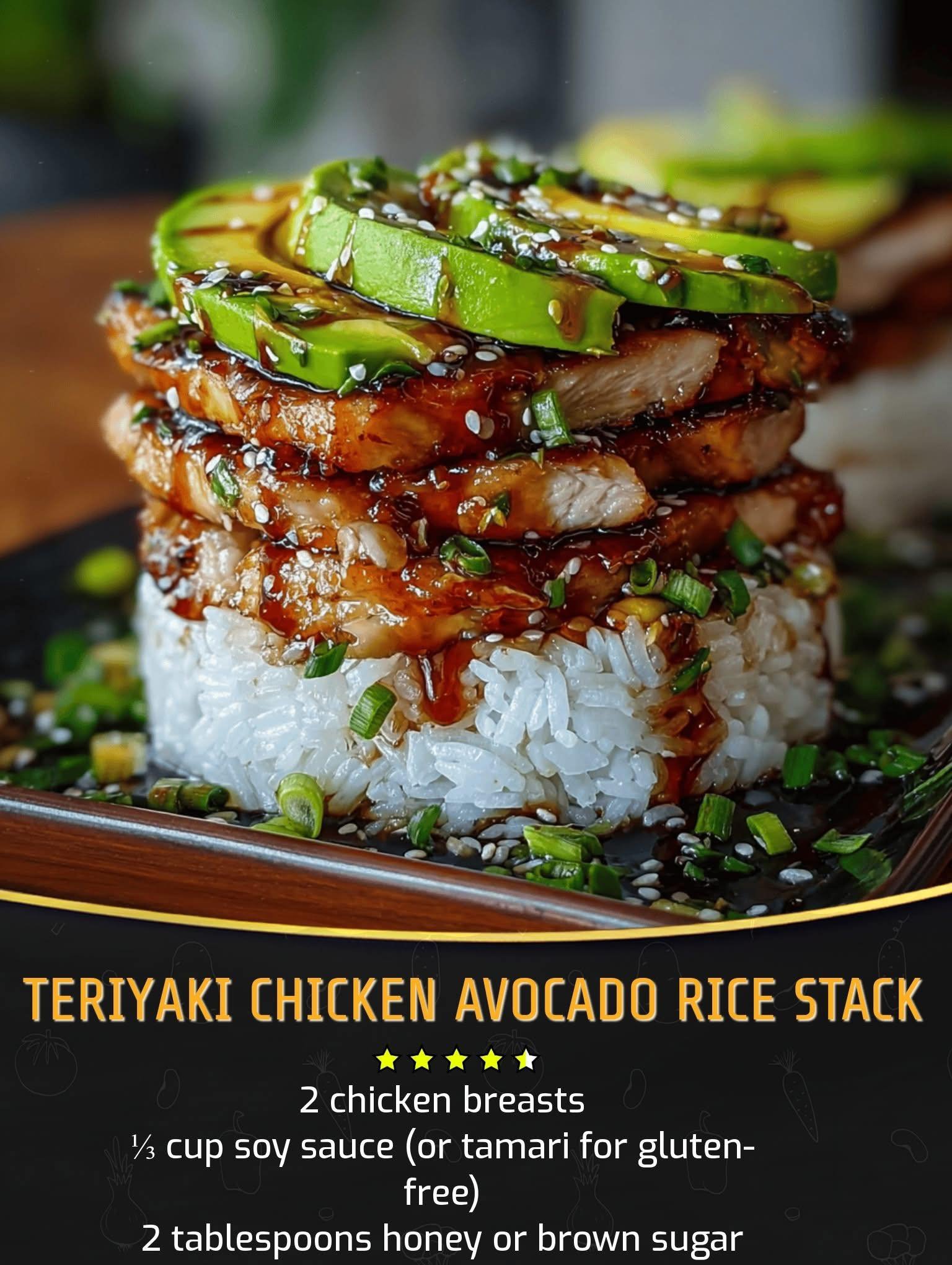 Teriyaki Chicken Avocado Rice Stack A fresh, flavorful, layered dish inspired by sushi stacks — loaded with tender teriyaki chicken, creamy avocado, and perfectly seasoned rice. If you love bold …