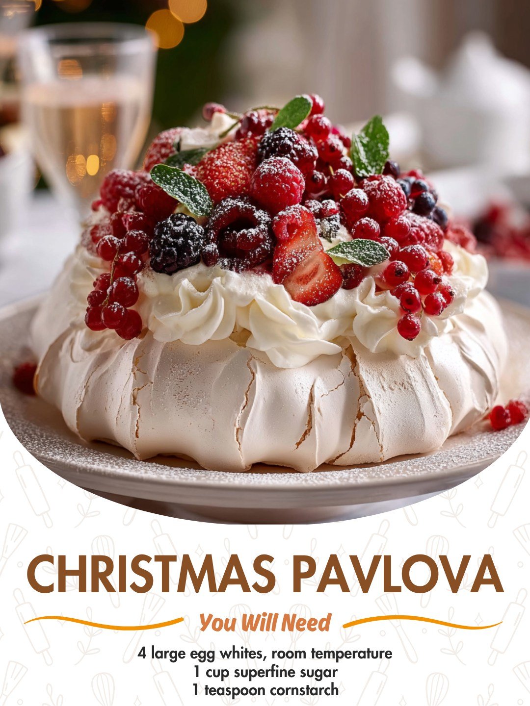 This Christmas Pavlova is a show-stopping dessert for the holidays. Crisp on the outside, soft and marshmallowy on the inside, and crowned with whipped cream and colorful fruits, it’s light, elegant, and perfect for festive tables. The meringue’s subtle sweetness pairs beautifully with tart berries, kiwi, and pomegranate seeds, making every bite a celebration.