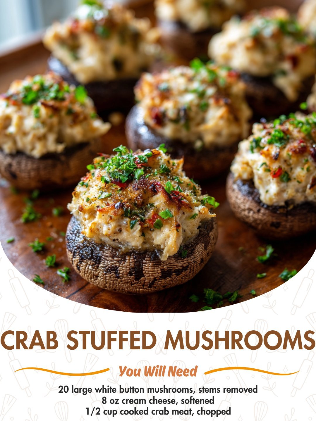 Spoon the crab mixture into each mushroom cap generously. Press lightly to secure, creating a little mound on top.