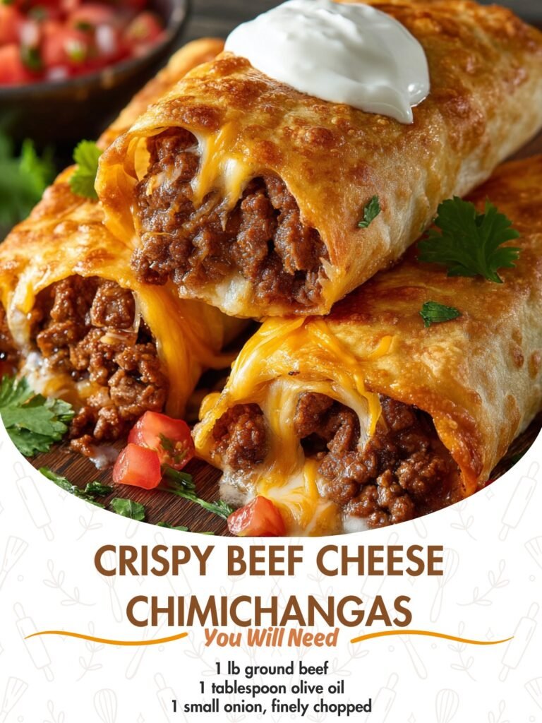 Crispy Beef Cheese Chimichangas 🌮🧀 Golden-fried tortillas stuffed with seasoned beef and melty cheese Description These Crispy Beef Cheese Chimichangas are everything comfort food should be—crispy on the outside, warm …