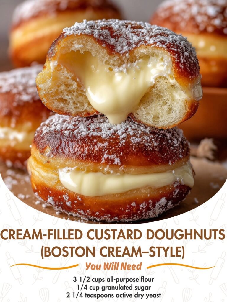 Cream-Filled Custard Doughnuts (Boston Cream–Style) Pillowy doughnuts filled with silky vanilla custard and finished with glossy chocolate Description These Cream-Filled Custard Doughnuts are everything a classic Boston Cream should be—soft, …
