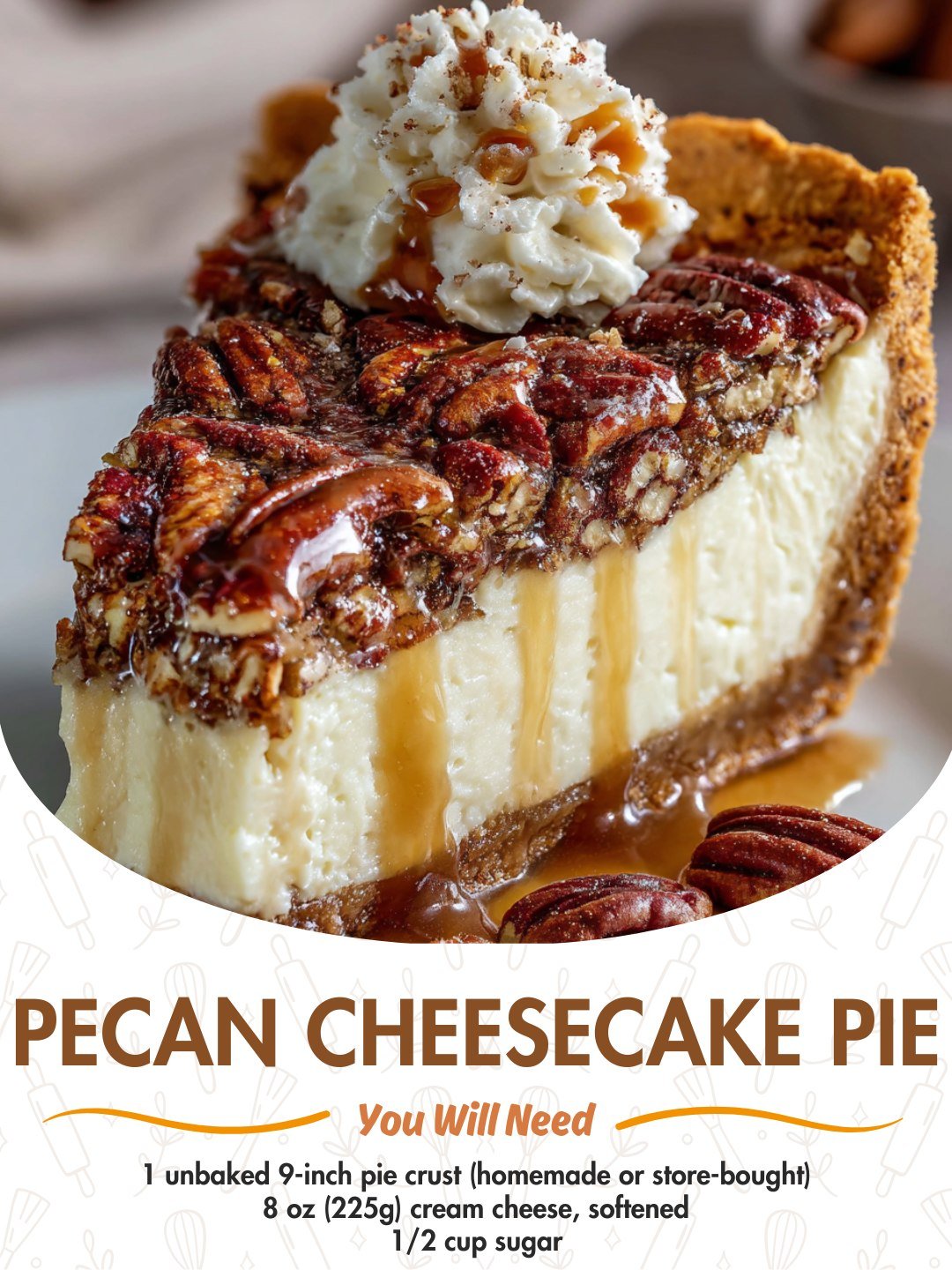 A decadent dessert combining creamy cheesecake filling with buttery pecans and a tender pie crust. Sweet, nutty, and irresistibly smooth, this pie is a guaranteed crowd-pleaser.